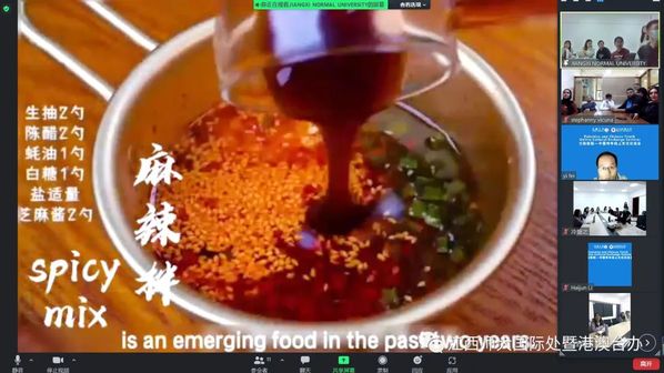 活动中,两校青年大学生依次自我介绍后进行了别开生面的美食文化分享。我校学生分成五组,分享了事先制作的以“辣”“面”“甜”“师大学子的一日三餐”和“西北风味”为主题的中国特色美食视频;圣城大学同学则以图片的形式展示了巴勒斯坦的手抓饭、穆萨罕配沙拉、鹰嘴豆丸子和特色甜品等美食。